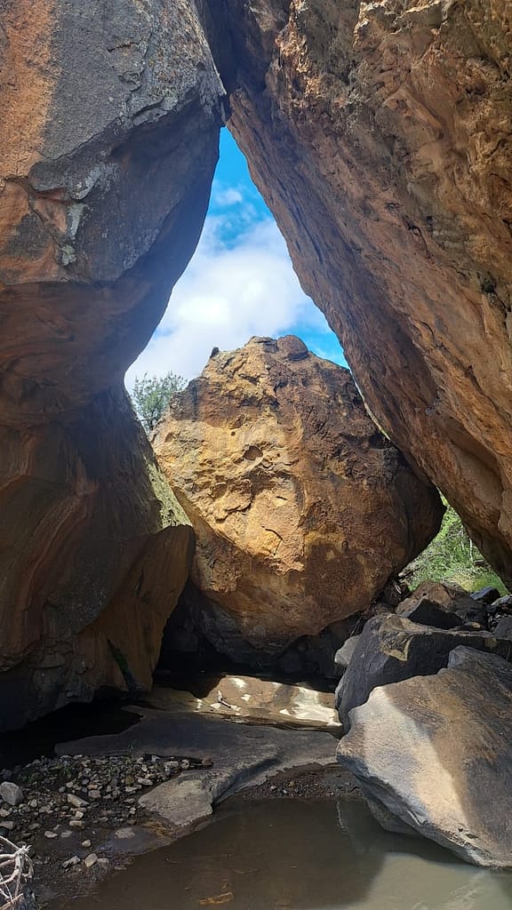 The Fouriesburg Watertunnels formed over millions of years through sandstone weathering. It lies hidden deep in the valley of the Rooiberg Mountain and was used as a hideout during the Anglo-Boer War.