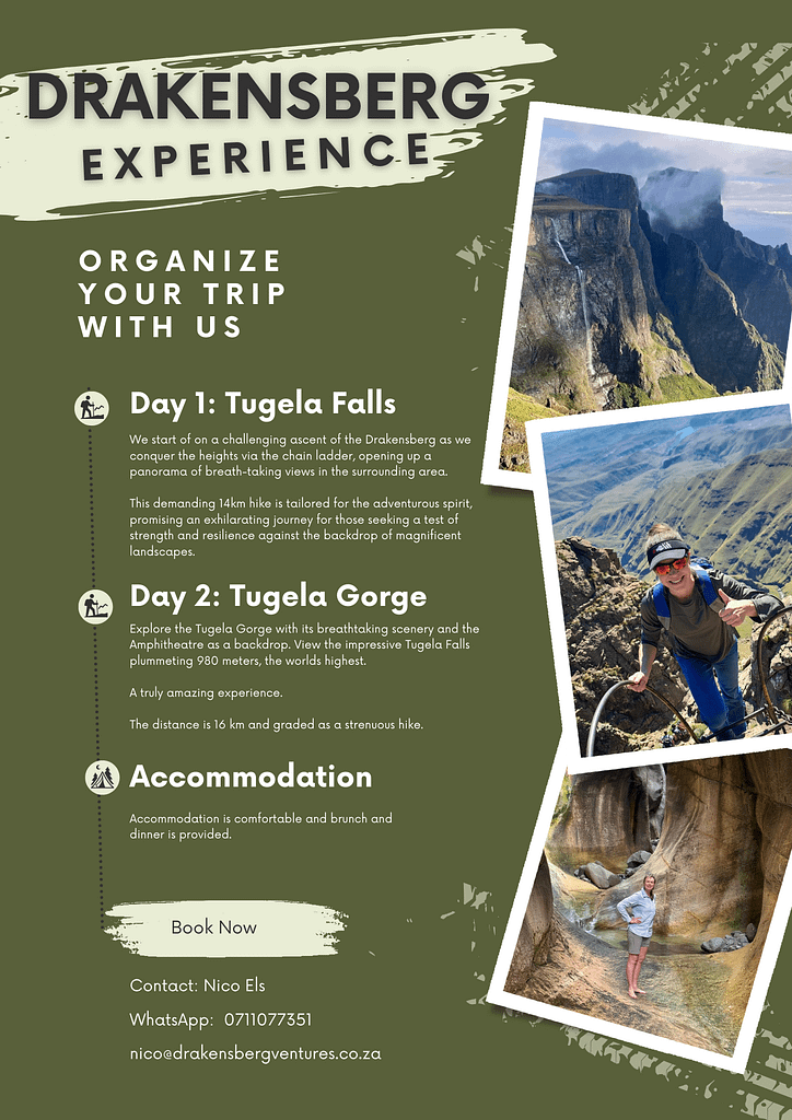 Day 3 starts off on a challenging ascent of the Drakensberg as we conquer the heights via the chain ladder, opening up a panorama of breathtaking views. The demanding 14 km climb is tailored for the adventurous spirit, promising an exhilarating journey for those seeking a test of strength and resilience against the backdrop of magnificent landscapes.